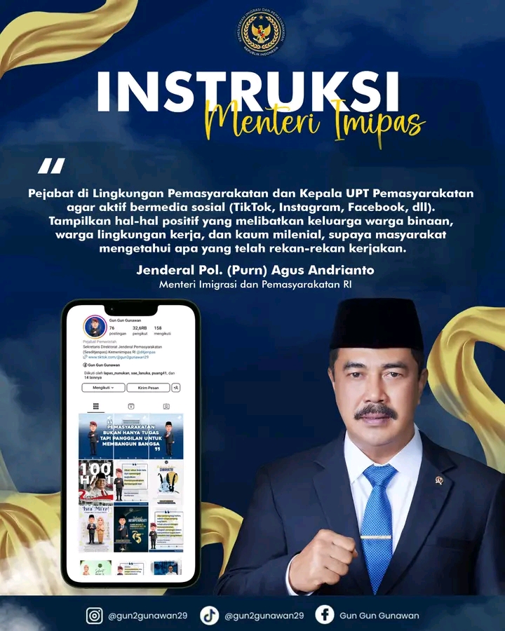 Tinta-rakyat.com//Kepada seluruh Pejabat Pemasyarakatan dan Kepala UPT Pemasyarakatan, sesuai dengan instruksi Menteri Imigrasi dan Pemasyarakatan RI, Bapak Jenderal Pol. (Purn) Agus Andrianto @agusandrianto.id , kami mengimbau agar rekan-rekan aktif menggunakan media sosial seperti TikTok, Instagram, Facebook, dan platform lainnya untuk menampilkan berbagai hal positif tentang Pemasyarakatan.