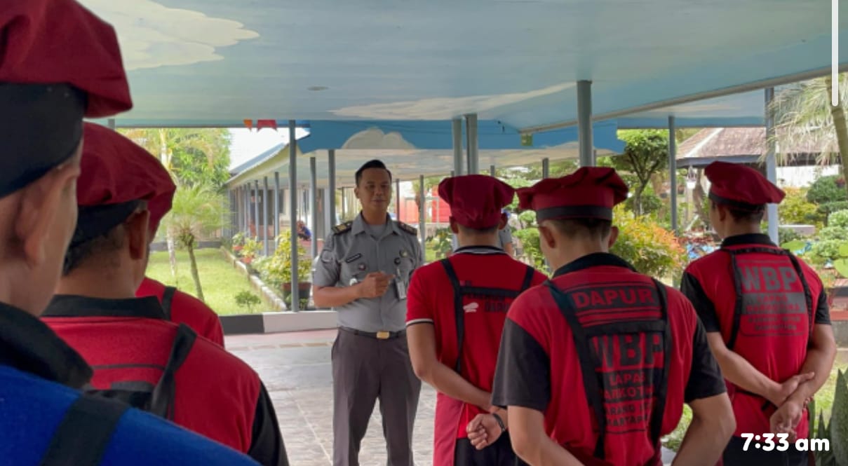 Menjaga kualitas layanan makanan bagi seluruh penghuni Lembaga Pemasyarakatan (Lapas) Narkotika Kelas IIA Karang Intan, Pelaksana Harian Kepala Seksi Pembinaan Narapidana/Anak Didik (Plh. Kasi Binadik), Fitriyadi Sukma, memberikan pengarahan kepada Warga Binaan Pemasyarakatan (WBP) yang bertugas di dapur, Selasa (27/5).