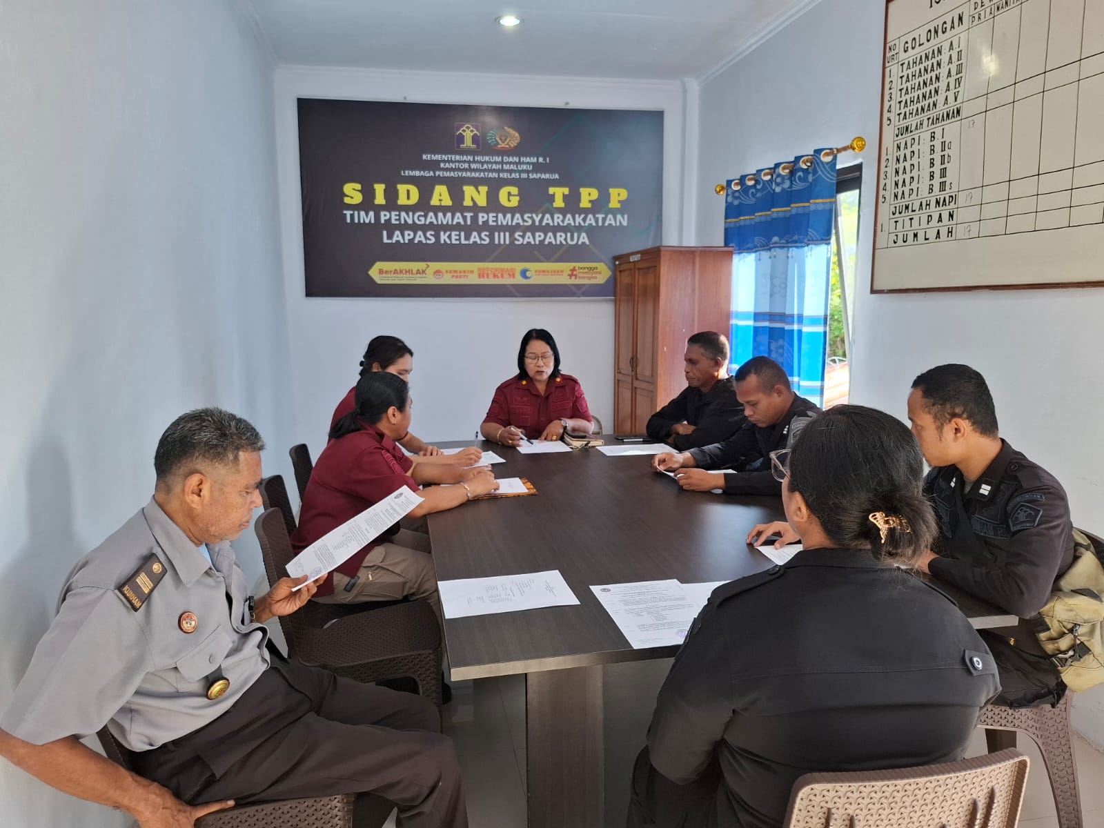 Tinta-rakyat.com-Saparua//Lapas Kelas III Saparua menggelar Sidang Tim Pengamat Pemasyarakatan (TPP) sebagai bentuk komitmen terhadap transparansi dan objektivitas dalam proses pembinaan warga binaan, Kamis (26/6). Kegiatan berlangsung di Ruang Admisi dan Orientasi dan diikuti oleh jajaran pejabat struktural yang tergabung dalam tim TPP.