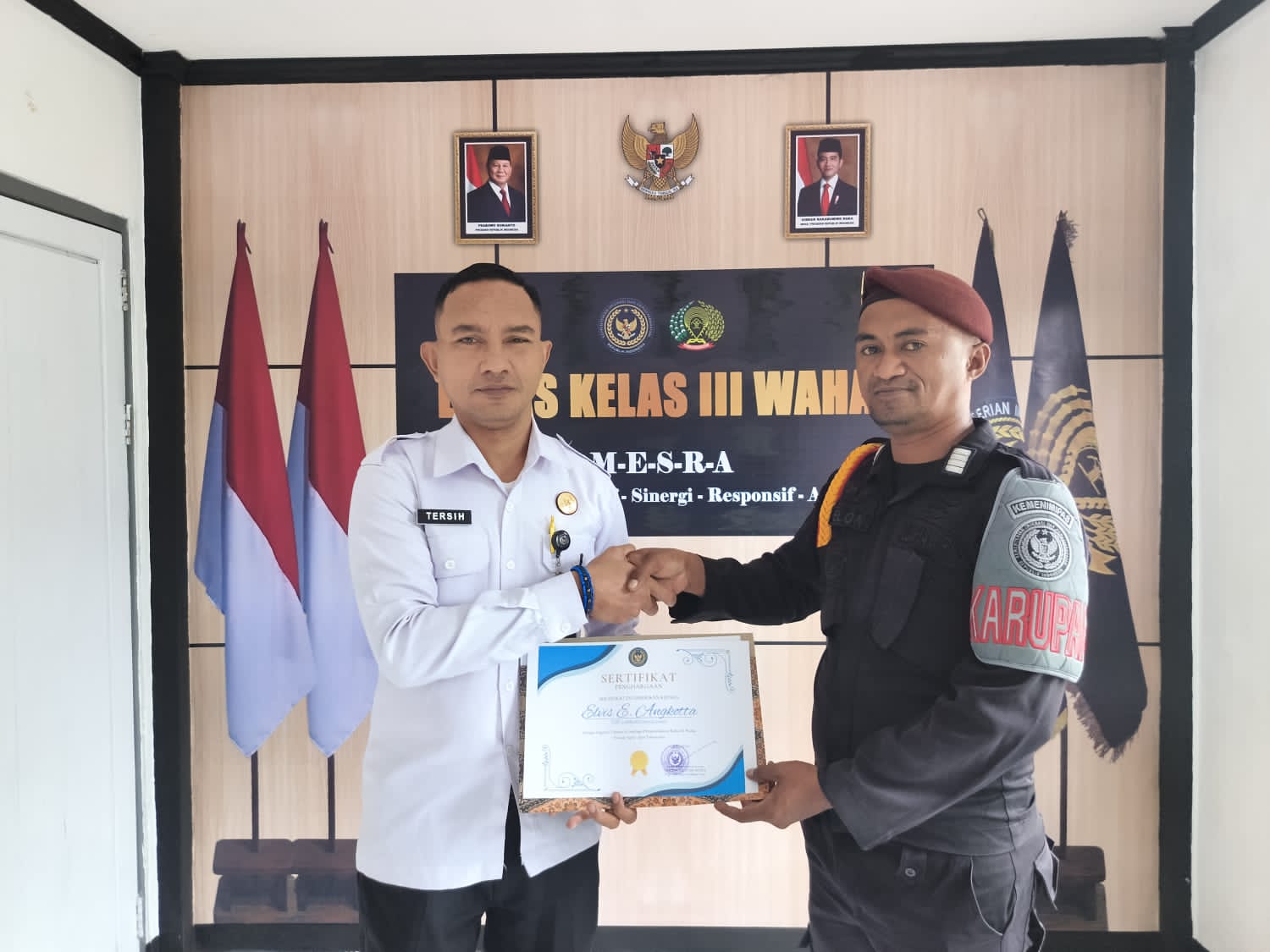 Dalam kegiatan yang berlangsung di Aula, Kepala Lapas (Kalapas) Wahai, Tersih Victor Noya, secara langsung menyerahkan piagam dan penghargaan kepada 2 Petugas yang terpilih yakni Elvis Elon Angkotta dan Andhika Setya Panayungan.
