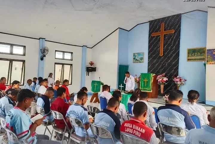 Tinta-rakyat.com-Piru//Lembaga Pemasyarakatan (Lapas) Kelas IIB Piru terus menunjukkan konsistensinya dalam pembinaan kerohanian bagi warga binaan. Kerjasama dengan Kementerian Agama (Kemenag) Kabupaten Seram Bagian Barat menjadi bukti nyata komitmen Lapas Piru dalam meningkatkan spiritualitas dan keimanan warga binaan, salah satunya melalui pembinaan bagi warga binaan kristen yang digelar di gereja Ebenhaezer Lapas Piru, Selasa(7/7).