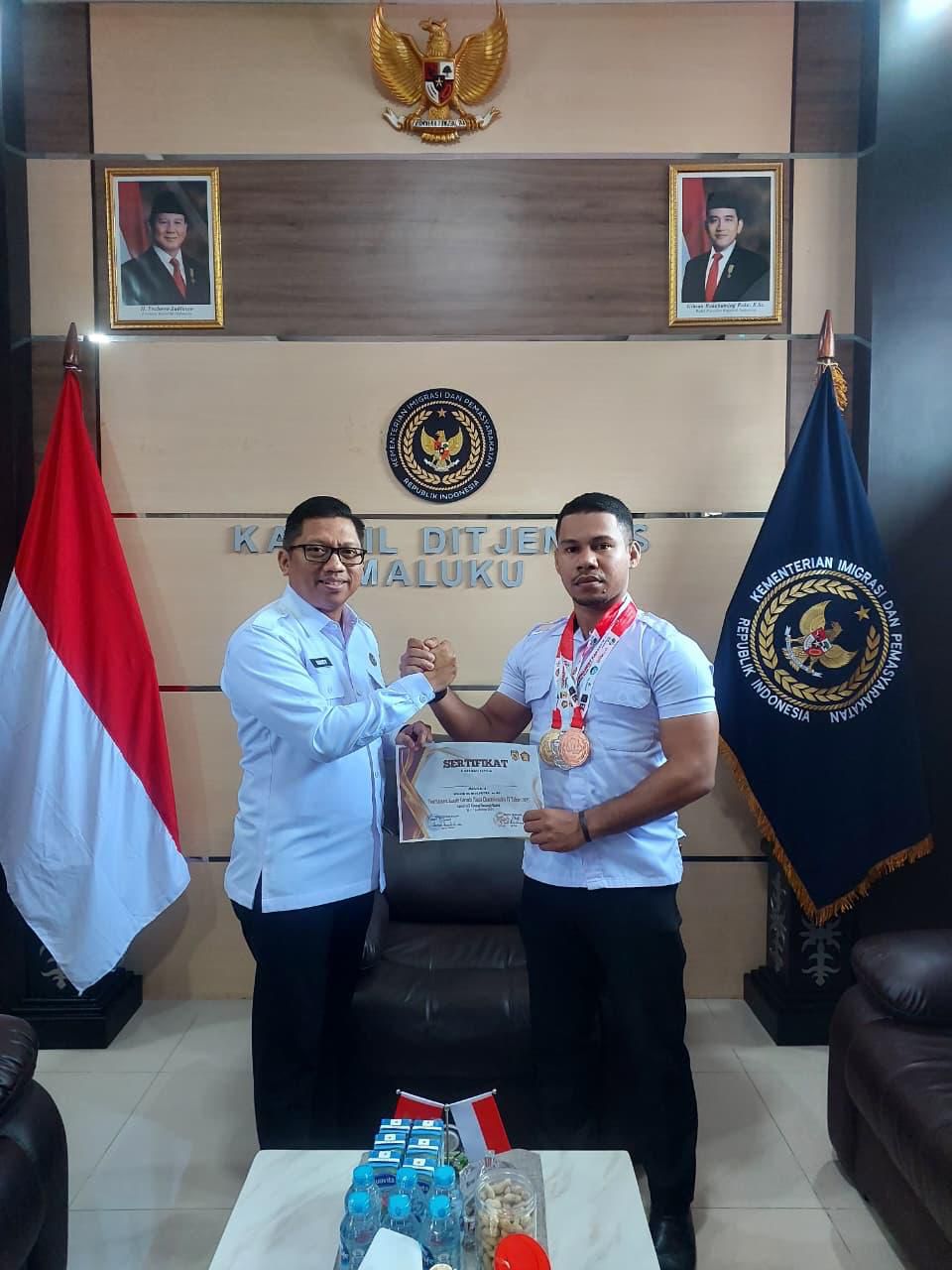 Tinta-rakyat.com-Ambon//Kepala Kantor Wilayah (Kakanwil) Direktorat Jenderal Pemasyarakatan (Ditjenpas) Maluku, Ricky Dwi Biantoro mengapresiasi capaian yang membanggakan dari salah satu petugas pemasyarakatan Maluku, Kevin Revuallo yang meraih medali pada ajang Tournament Garuda Yaksa Championship IV Tahun 2025 di Provinsi Maluku, Senin (24/9).