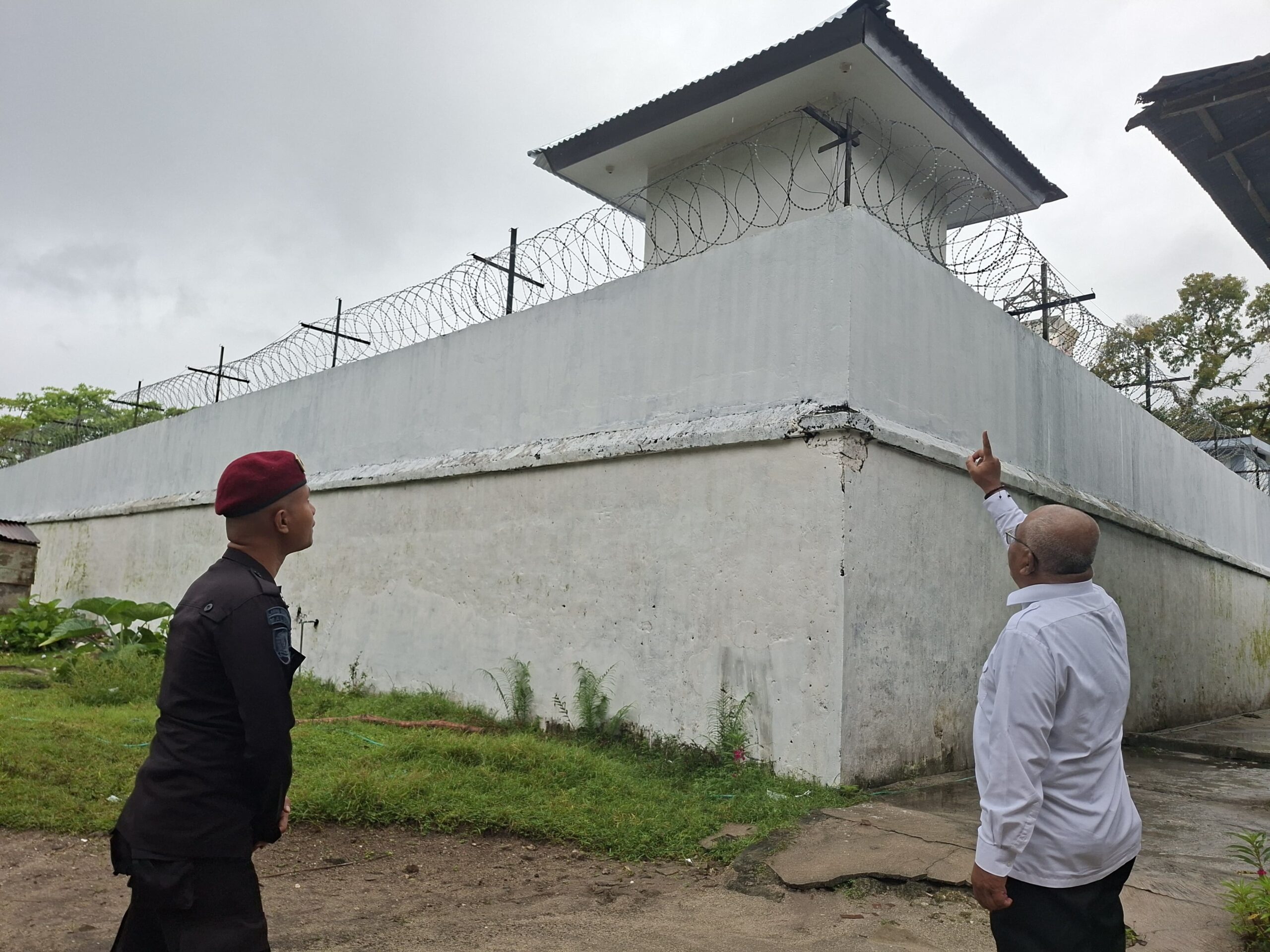 Tinta-rakyat.com-Saparua//Kanwil Ditjenpas Maluku, Kepala Lembaga Pemasyarakatan (Lapas) Kelas III Saparua, Pramuaji Buamonabot, didampingi Kepala Regu Pengamanan (Karupam) II, La Sawal, meninjau kondisi pos menara depan dan belakang setelah selesai diperbaiki. Kegiatan berlangsung di area pengamanan utama Lapas Saparua. Rabu (08/10).